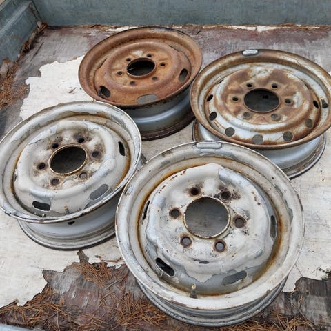 Japanialaisen lava-auton jaolla (6x139,7) 14 tuuman mangelsvanteet. Kohtuullisesti patinoituneet. Renkaat on vanhat, ja pintaakaan ei ole paljon, mutta kyllä nuukempi henkilö ajaa ainakin juhannukseen asti näillä.