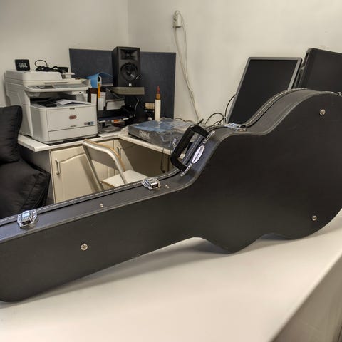 Siisti ja ehkä pehmustettu kantokassi sähkökitaralle. Säilytystasku vetoketjulla pikkutavaroille. Kassia voi kantaa kahvoista ja olkapäällä kuljetukseen myös kantoremmi. Edellisen omistajan nimi näkyy himmeästi kassin takapuolelle.