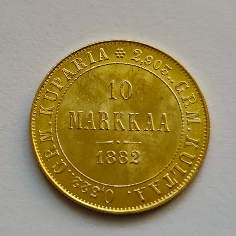 Suomen 10 markan kultaraha vuodelta 1882. Toisella puolella teksti "10 markkaa" ja vuosiluku 1882, reunassa tekstiä rahasta ja materiaalista. Kääntöpuolella kaksipäinen vaakuna ja teksti "Finland Suomi". Sopii esimerkiksi kokoelmiin tai numismatiikan harrastajalle.