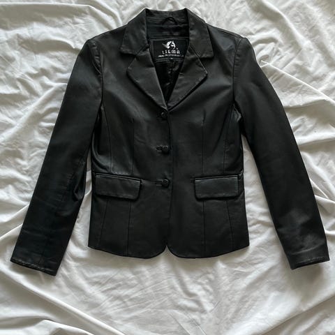 2NDDAY ohut musta nahkableiseri, koko XS-S (kokolapussa 36), vähän normaalia lyhyemmät hihat. (Hieman lyhyemmät hihat sopii hyvin tähän tyyliin ja sisäpukeutumiseen kun rannekorut jää hyvin näkyville). Ulkomateriaali on aitoa nahkaa ja vuori polyesteriä.