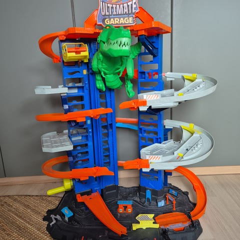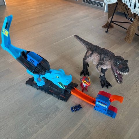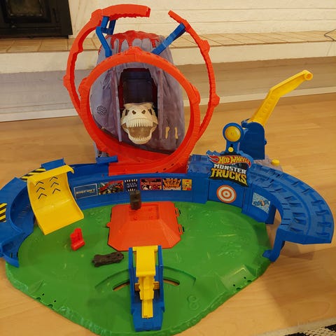 Hot Wheels dinosaurusteemainen monsteriauto joka syö autoja. Äänet ja valot toimii. ja pieni monsteriauto.