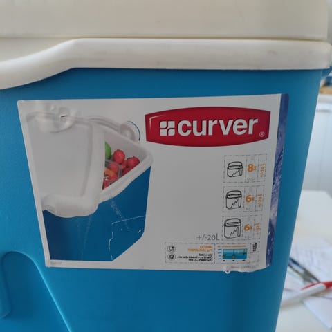 Muovinen, siisti ja kunnossa oleva kylmä/lämpölaukku. 1,5l pullot mahtuvat pystyasennossa hyvin laukkuun. Toimii 12V. Kansi lukkiutuu kantokahvalla.