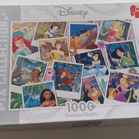 Ravensburger Disney -palapeli, jossa 1000 palaa. Kuvituksena Lumikki ja seitsemän kääpiötä -aiheinen kuva. Ravensburgerin palat ovat tukevia ja tarkasti leikattuja, mikä helpottaa kokoamista.