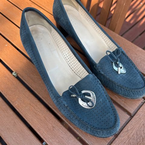 Myydään italialaiset korkokengät kokoa 39. Materiaali sininen nahka ja mokkanahka. Kantaremmisäätö. Kenkiä käytetty vain juhlissa siksi hyväkuntoiset.