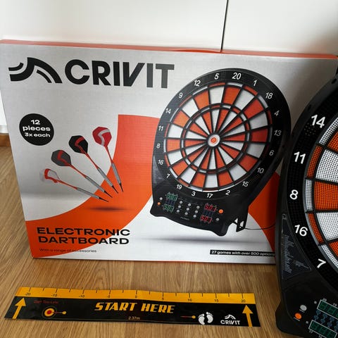 Myytävänä tikkataulu ja 6 tikkaa.