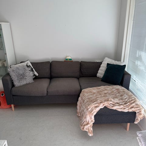 Huom: toisessa käsinojassa eri väri (Gunnerad keskiharmaa). Tähän saa helposti Ikeasta uuden päällisen noin 40€ hintaan, tai vaihtoehtoisesti voi uusia kaikki päälliset.
