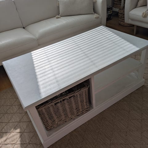Myydään iskun valkoinen sohvapöytä. Pöydän koko 120 x 80 cm, korkeus n. 47cm.