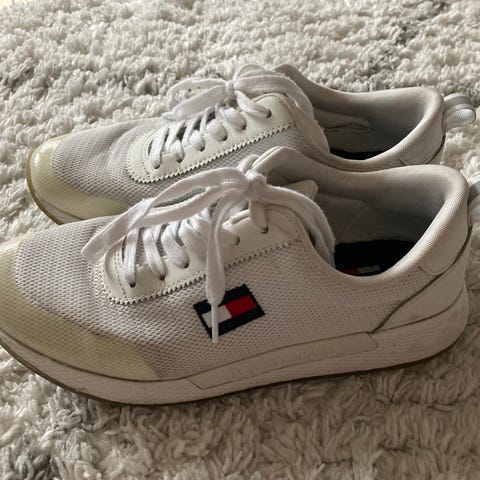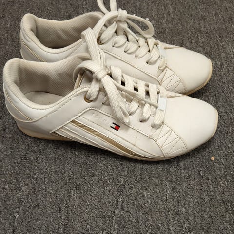 Tommy Hilfiger valkoiset pyöreäkärkiset nahkatennarit, koko 37. Sivulla merkin sinipunavalkoinen paljettilogo ja sisäsivulla vetskari. Pohjalliset pehmeät ja anatomisesti muotoiltu. Siistit ja melko vähäisiä käytön jälkiä ulkopuolella.