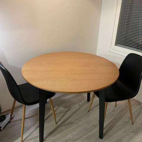 Ruokailuryhmä 110cm leveä musta pyöreä pöytä. Neljä valkoista tuolla. Naarmuja on tuoleissa sekä pöydässä mutta ovat täyttä puuta ja tukevat. Pöydästä saa jalat irti.