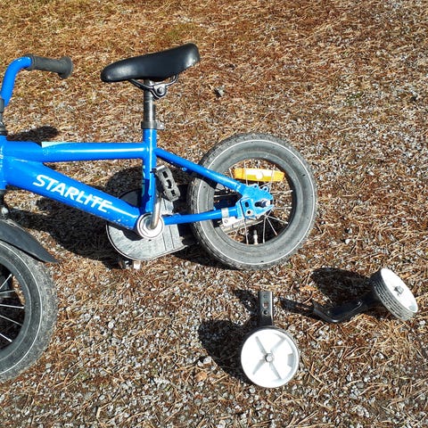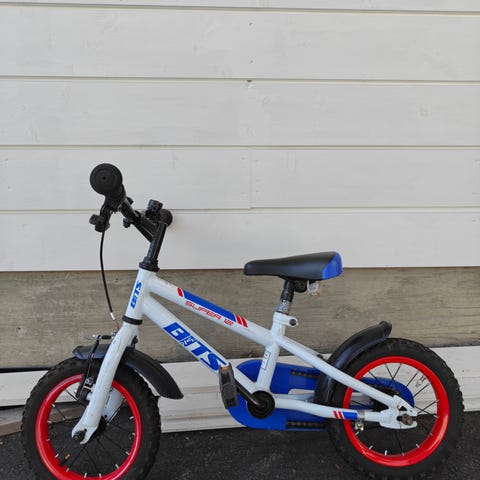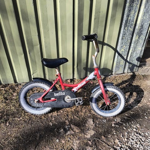 Lasten polkupyörä, täysin ehjä mutta käytön jälkiä on. Apupyörät saa kiinnitettyä, kaikki tarvittavat kiinnitysosat löytyy pussista joka näkyy kuvassa.