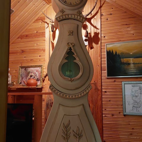 Omavalmisteinen "könninkello". Korkeus n.210cm, hienokuntoinen, koneisto ei käy, saattaa olla että ketju tippunut rattaalta. En ole avannut takakantta tutkiakseni tarkemmin.