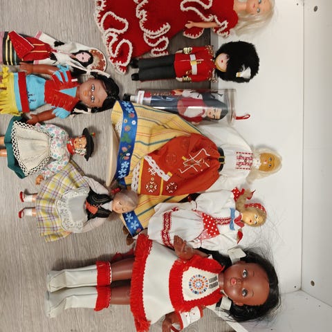 60-luvun kansallispukuinen Paula-nukke alkuperäisessä pakkauksessaan. Toinen tossu on lähtenyt nuken jalasta, joten on pakkauksessa irrallaan.