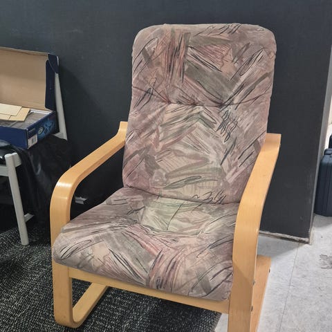 Nojatuoli josta reunan jouset mennyt lyttyyn. Kuvassa näkyvällä ratkaisulla edelleen ollut hyvä istuttava. Viltin saa mukana 🤭 Haku Ruskealan alueella