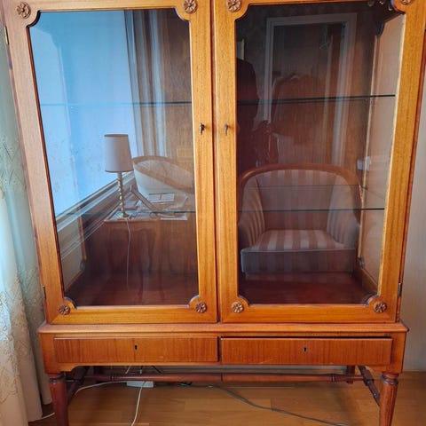 Chippendale lasivitriini lasihyllyillä ja lasiliukuovilla.