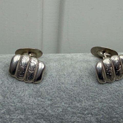 Kalvosinnapit miehille. Materiaalina hopea, leimattu 830H. Kalvosimissa on suorakaiteen muotoinen, kohokuvioitu etuosa ja sileä, soikea kiinnitysosa. Sopivat käytettäväksi miesten kauluspaidan kalvosimissa juhla- tai arkiasussa. Vuosi 1972. Lukossa kaiverrus V.P. Kunto hyvä.Rasiassa.