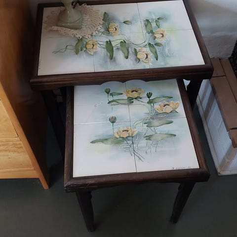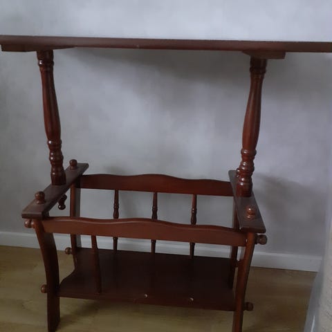 Kuvanmukainen pöytä. Halk. 38,5cm korkeus 59cm. Käytönjälkeä. Nouto