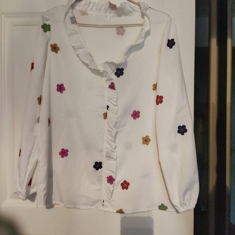 Punainen pusero, etuosa sileää kangasta, hihat ja takaosa trikoota. Koko S/M.