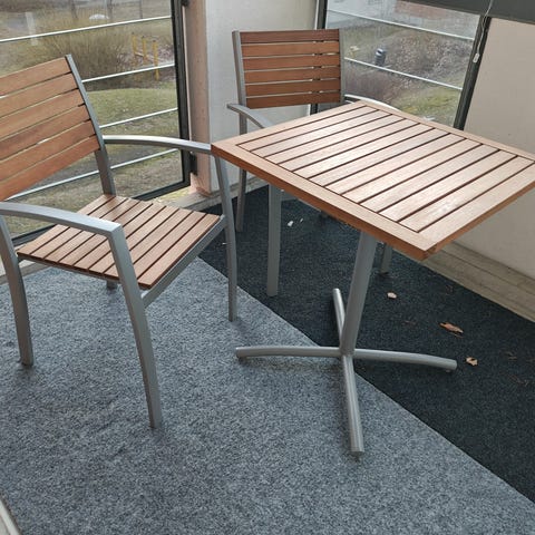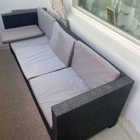Pöytä, 2 nojatuolia ja sohva+pehmusteet. Kaikki vaatii pesua, pesu jää ostajalle. Pehmusteet ovat haalistuneet, käytönjälkiä löytyy.