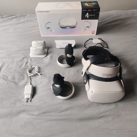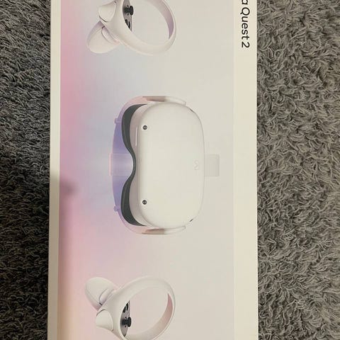 Meta Quest 2 VR-lasit ohjaimilla. Pakkaus sisältää virtuaalilasit päänauhalla sekä kaksi käsiohjainta. Langaton itsenäinen VR-laite, jota voidaan käyttää esimerkiksi pelaamiseen, virtuaalikokemuksiin ja sovelluksiin yhteensopivien laitteiden ja palveluiden kanssa. Valkoinen väri, säädettävä panta ja sisäänrakennetut sensorit liikkeen seurantaan.