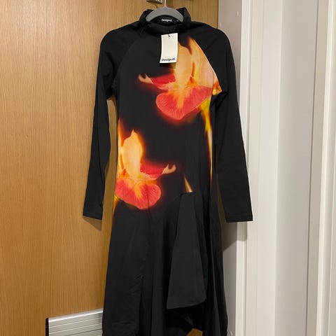 Desigualin mekko, jossa värikäs ja taiteellinen kuosi.