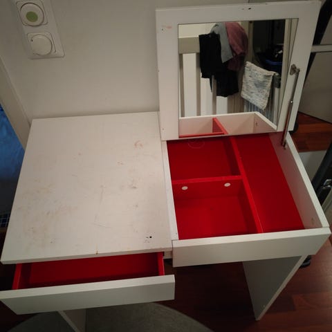 Lipaston ylälaatikon päällä oleva lista lähtenyt irti ja alin poikki. Laatikot kuitenkin toimivat. Yläkansi huonosti kiinni, saanee laitettua/korjattua. Muuten siisti, ei ole kolhuja ym pinnoissa.