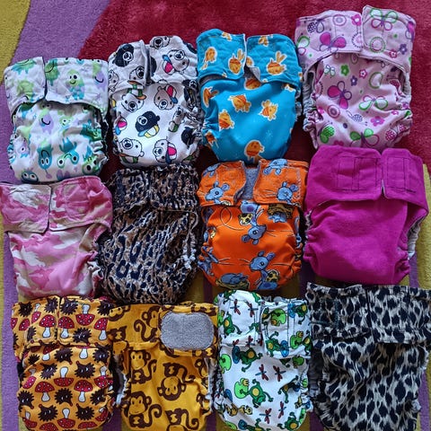 Kestovaippasetti, eri merkkejä, yhteensä 18 kuorivaippaa ja 14 imua. Sis. 6kpl vauvan mukana kasvavia nepparein säädettäviä kivoilla kuoseilla (tosi kätevät, meidän lempparit!), 3kpl Muksut -merkkisiä koko s-m (5-10kg), 8kpl s-kokoista joista yksi Poplini-merkkinen, yksi Modern baby, ja yksi Totsbots, loput netistä ostettuja käsin tehtyjä, ja vielä 1 m-kokoinen rainbow-vaippa. Imut erilaisia. Mukaan myös pari rullaa vaipan vuoraukseen tarkoitettua kuitupaperia. Kaikki vaipat 90-asteessa pestyjä, lemmikitön talous. Nouto Kontulasta, myös lähetys mahdollinen.