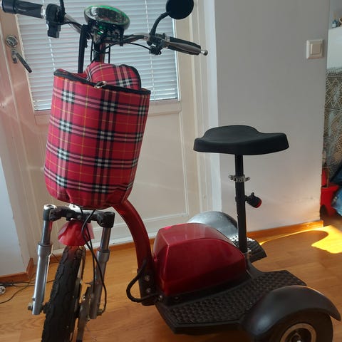 Leijona 500 sähköskootteri on nelipyöräinen malli, jossa on punainen kori ja musta istuin. Skootterissa on digitaalinen mittaristo, jossa näkyvät muun muassa nopeus ja ajettu matka. Ajolauta on matala ja tasainen helpottamaan kyytiin nousua. Takana on lukittava tavaralaatikko pientä kuljetusta varten. Ajomukavuutta lisäävät käsinojallinen istuin ja selkänoja. Ajoneuvossa on etuvalo, suuntavilkut ja heijastimet näkyvyyden parantamiseksi. Nelipyörärakenne ja leveät renkaat tuovat vakautta hitaassa ajossa ja pysähdyksissä. Sähköskootteri soveltuu esimerkiksi asiointiajoihin ja lyhyisiin siirtymiin taajama-alueilla. Sähköskootterilla on ajettu 750 km ja on erinomaisessa kunnossa