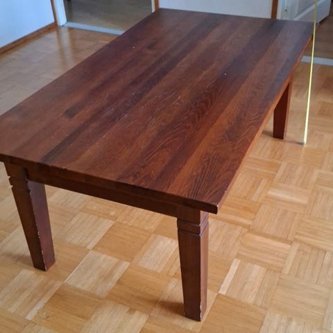 60x60x38cm sohvapöytä. tukeva ja painava. vähän käytönjälkeä reunoissa.