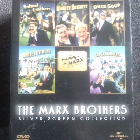 The Marx Brothers Collection DVD-boksi. Kokoelma sisältää kuusi Marx-veljesten komediaelokuvaa suomenkielisillä kansilla. Elokuvat on pakattu yhteiseen koteloon, jossa jokaisella levyllä on oma kotelonsa. Tuote on tarkoitettu DVD-soittimelle ja sopii Marx Brothers -elokuvien ystäville sekä kokoelmakäyttöön. Ilta oopperassa, Päivä sirkuksessa, Päivä tavaratalossa ja Päivä kilpa-ajoissa uusia muoveissa. Kaksi muuta oikein hyvässä kunnossa.