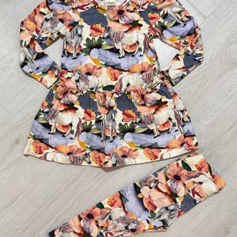 Ma-ia Family Poppy-kuosiset lasten leggingsit. Koko 98. Materiaali 95 % puuvillaa ja 5 % elastaania, joustava ja pehmeä trikookangas. Monivärinen, kirjava kuosi, jossa kukkia ja yksisarvisia. Kuminauhavyötärö. Sopii arkeen ja vapaa-aikaan käytettäväksi esimerkiksi tunikan tai paidan kanssa.