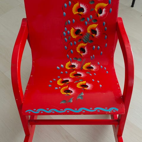 Ehjä ja tukeva retro lasten punavalkoinen keinutuoli. Korkeus 50 cm ja leveys 36 cm.