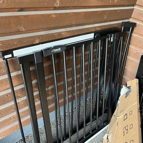 Valkoiseksi maalattu metallinen Trofast-turvaportti portaiden alapäähän estämään lasta kiipeämästä portaisiin. Asennukseen ei tarvita poraa eikä ruuveja. Ei jätä jälkiä karmiin eikä seiniin. Säädettävä koko, 730-805 x 730 mm