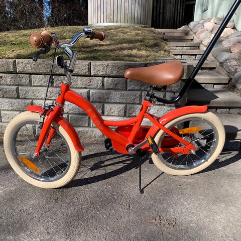 Stoy lasten polkupyörä, jossa 16" renkaat ja musta runko. Pyörässä on suora ohjaustanko, jalkatuki, lokasuojat sekä ketjusuoja. Satula ja ohjaustanko ovat säädettävissä lapsen pituuden mukaan. Pyörässä on myös työntöaisa aikuisen avustamaa ohjausta varten. Sopii lapselle, joka käyttää 16" kokoista lastenpyörää.