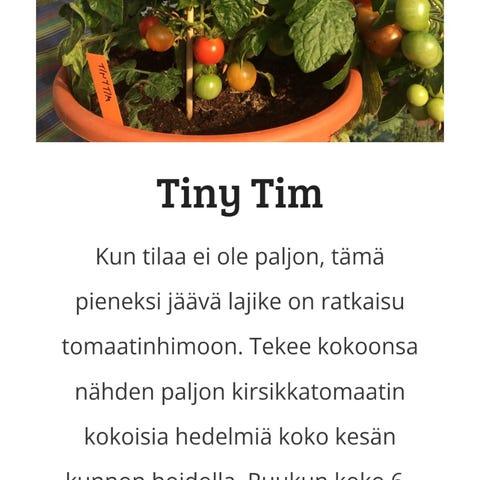 Pensastomaatti Red Robinin taimia. Helppo kasvatettava ruukussa terassilla tai parvekkeella. Satoisa lajike, tekee runsaasti pieniä makeita kirsikkatomaatteja. Varkaita ei poisteta. Tuettava. Kasvukorkeus 40-50cm.