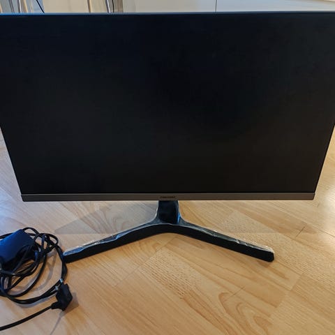 Samsung LS24E390HL tietokonenäyttö, 24 tuumaa. Valkoinen runko ja jalusta. Näytössä on HDMI-liitäntä sekä virtaliitäntä takapaneelissa. Soveltuu yleiseen tietokonekäyttöön, kuten työskentelyyn ja pelaamiseen