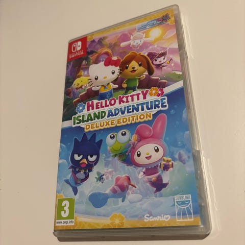 Hello Kitty Island Adventure Deluxe Edition Nintendo Switch -peli. Pakkaus sisältää pelikasetin sekä Deluxe Edition -lisämateriaalit, kuten oppaan ja keräilykortteja. Valitettavasti julisteet ovat hävinneet.