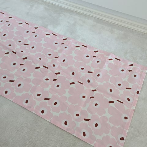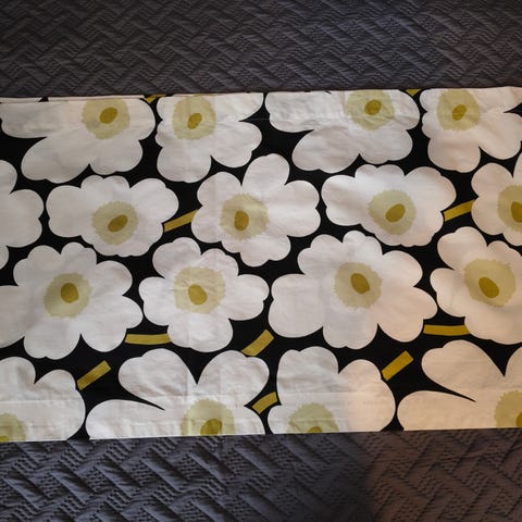 Myydään Marimekon kankaasta ommeltu kappaverho. Tankokujaan tehty pieni aukko verhotangon kannattimelle. Ei näy etupuolelle.
