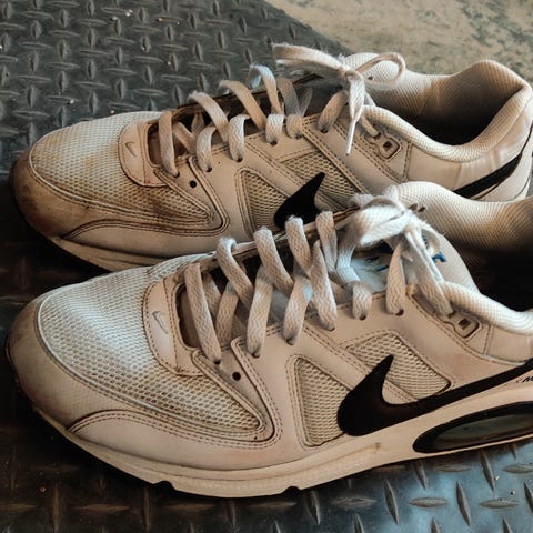 Nike Air Max tennarit, koko 44. Väriltään harmaat mustilla ja keltaisilla yksityiskohdilla sekä valkoisella logolla. Kengissä on Air Max -vaimennusyksikkö kantapäässä ja nauhakiinnitys. Soveltuvat arkikäyttöön ja vapaa-aikaan.