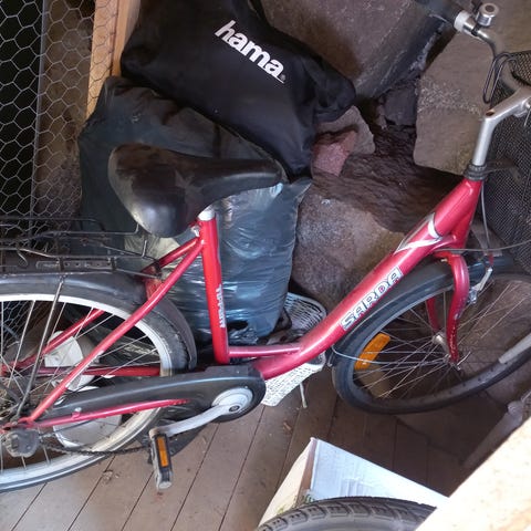 Naisten pyörä jossa Hamax sleepy lastenistuin. Runkolukko johon avain. Seissyt pari vuotta pihalla. Takakumi nyt tyhjä, ollut ehjä kun viimeksi poljettu kesällä -24 eli varmaan tokenee kun pumppaa ilmaa. Ollut käytössä 160cm pituisella aikuisella.
