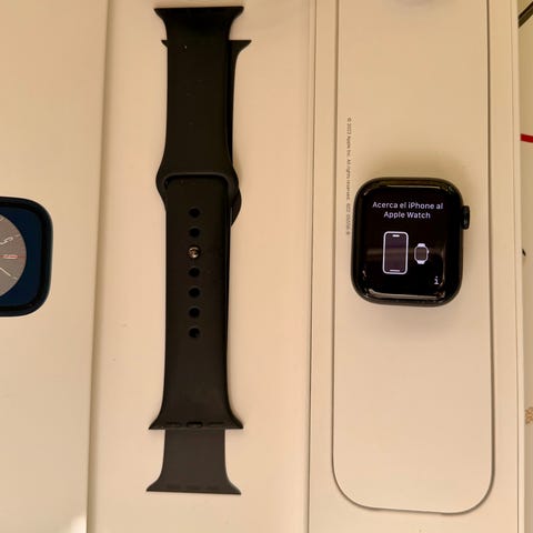 Apple Watch ja siihen kuuluvia silikonirannekkeita ja metallinen ranneke.