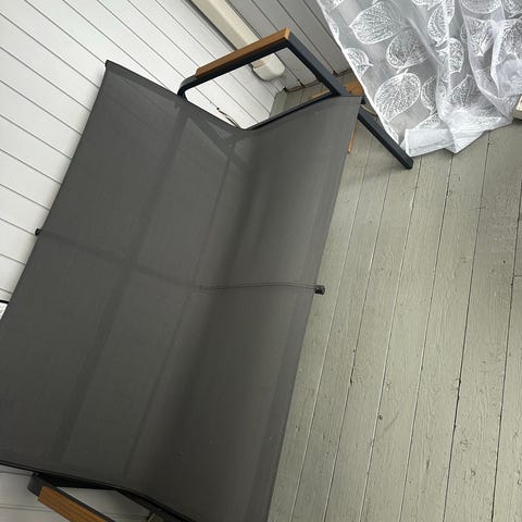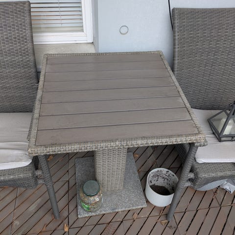 Myydään tilanpuutteen vuoksi metallinen parvekepöytä, väriltään musta. Pöydän kansi on ritilä- tai verkkomainen, mikä mahdollistaa veden läpäisyn ja helpottaa ulkokäyttöä.