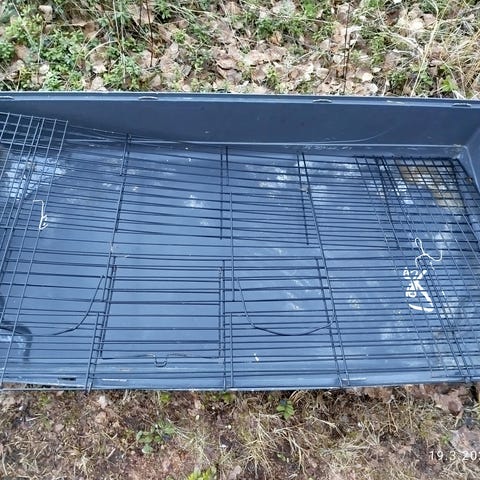 Häkki kanille / jyrsijälle. Muovinen pohja ja metallinen häkkiosa, jonka saa laitettua kasaan. Koko 117cm x 56 cm x 56 cm.