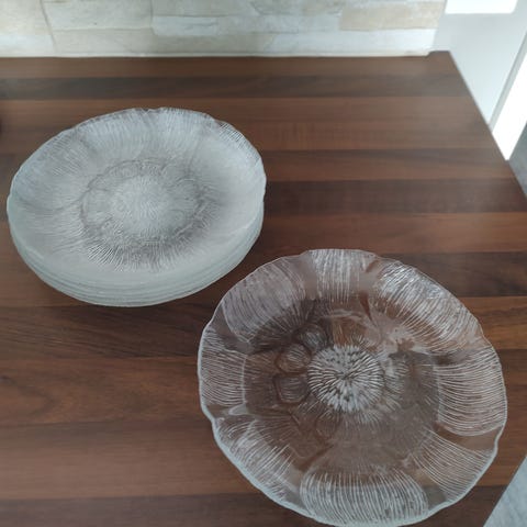 Kirkkaat lasilautaset, joissa kohokuvioitu koristeellinen kuvio. Lautaset sopivat esimerkiksi kattaukseen, tarjoiluun tai koristekäyttöön. Materiaali on läpinäkyvää lasia ja muotoilu on pyöreä, reunoilla kiertävä kuviointi.