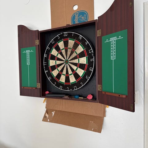 Hieno tikkataulu kaapilla..kork.64 cm....lev. 50cm....kulmissa hieman sanomista...itse taulu vielä paketissa....tikat kaupanpäälle....nouto sovitusti.