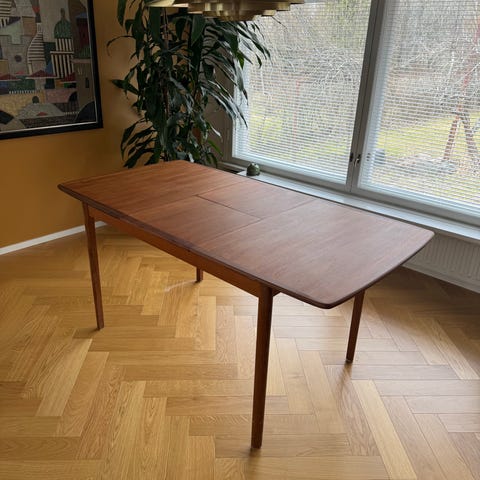 Korkeus 75 cm. Pituus 110 cm. Leveys 80 cm. Jatkettava, mutta jatkopala puuttuu.