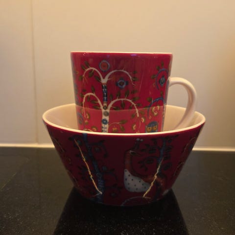 + kaupanpäälle punainen iso muki, ylhäältä hieman lohjennut (kts kuva)