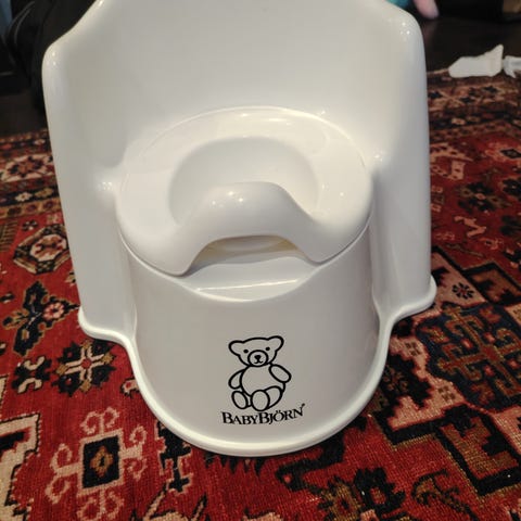 BabyBjörn potta, valkoinen muovinen. Irrotettava sisäosa helpottaa tyhjentämistä ja puhdistamista. Pohjassa liukuesteet, jotka auttavat pitämään potan paikoillaan kovalla lattialla. Jotain naarmuja käytöstä, mutta muuten oikein hyväkuntoinen ja ehjä. Nouto Espoon Olarista tai pk ostajalle.