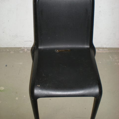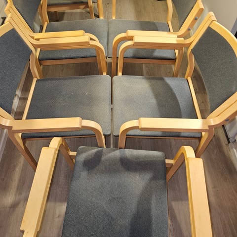 Kohtalaisessa kunnossa olevat ruokailutuolit 4kpl. Istuinosa ruskea puunvärinen ja selkänoja ja jalat musta.