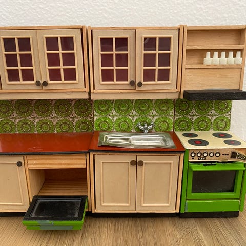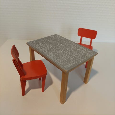 Lundby nukkekodin pöytä ja neljä tuolia. Pöytä ja tuolit ovat punaista puuta. Tuolien istuimissa on sinivalkoraidallinen kangasverhoilu. Pyöreän pöydän halkaisija on noin 7 cm (kuvassa mitta). Kalusto sopii Lundby-nukkekotiin tai vastaavan kokoiseen nukkekotiin ruokailu- tai oleskelutilan kalusteeksi.