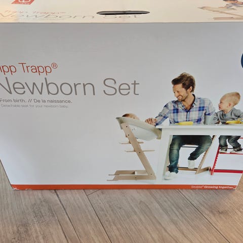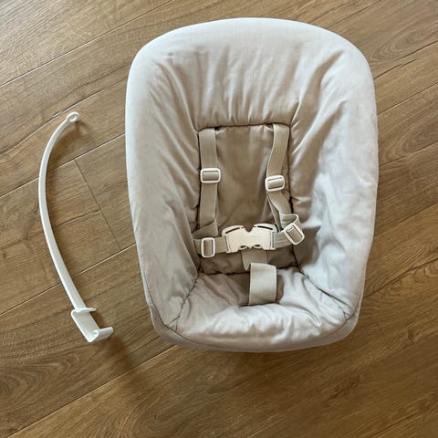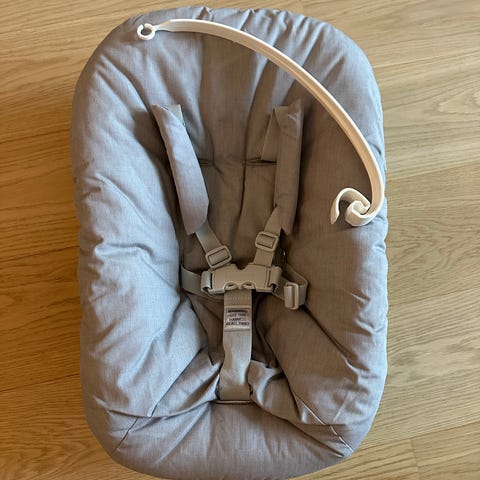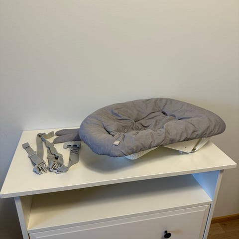 Stokke Tripp Trapp Newborn Set syöttötuoli-istuin vastasyntyneelle. Harmaa pehmustettu istuinosa, jossa on turvavaljaat. Tarkoitettu käytettäväksi Stokke Tripp Trapp -syöttötuolin kanssa